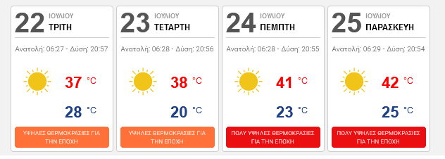 Τετάρτη: Καύσωνας θα επικρατήσει και την Τετάρτη στην Ήπειρο, με λιακάδα κι έντονη ζέστη. Ο υδράργυρος το μεσημέρι θα φτάσει τους 40°C στα πεδινά και τα ημιορεινά, τους 37°C στα ορεινά και τους 36°C-38°C στα παραθαλάσσια τμήματα.