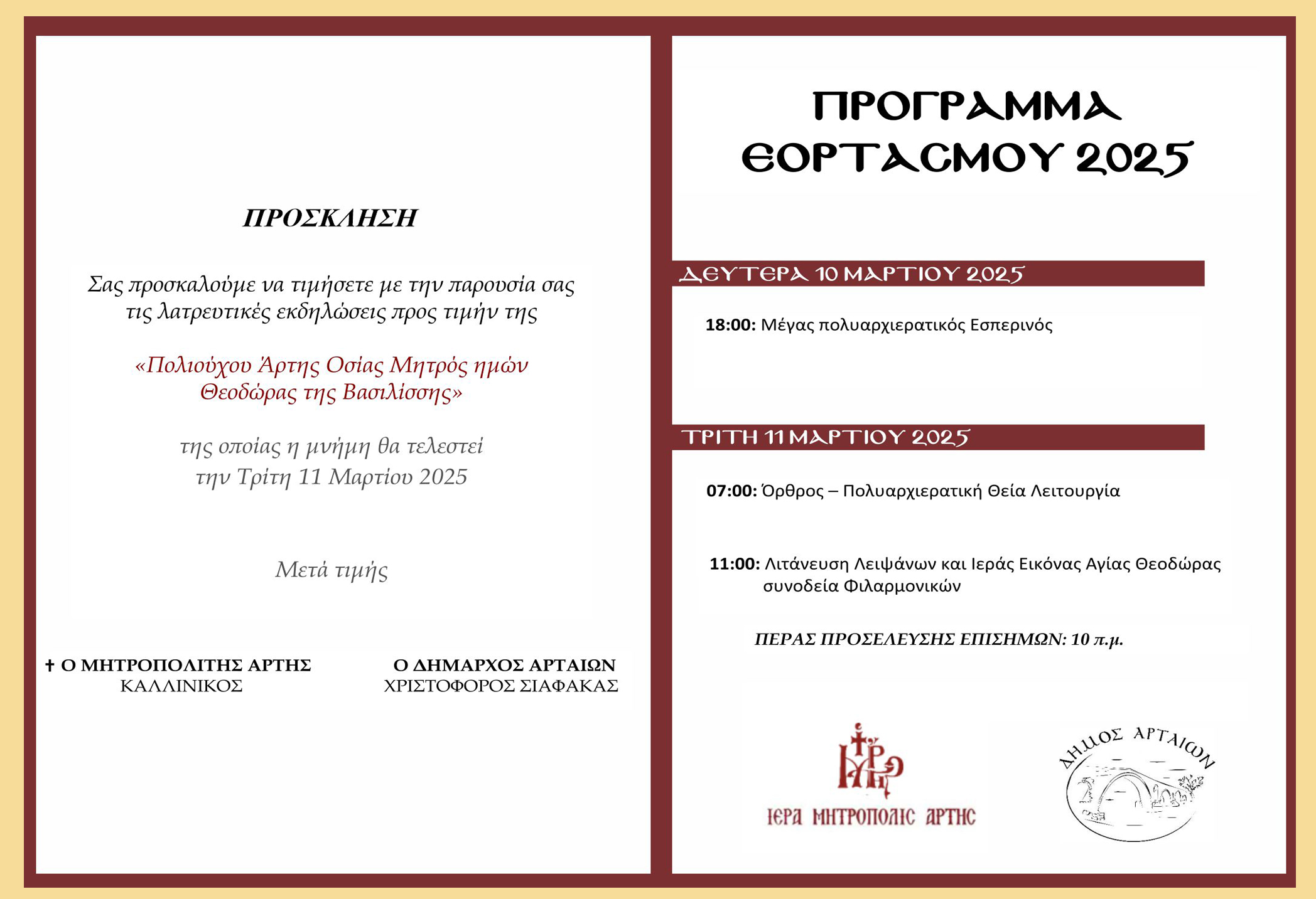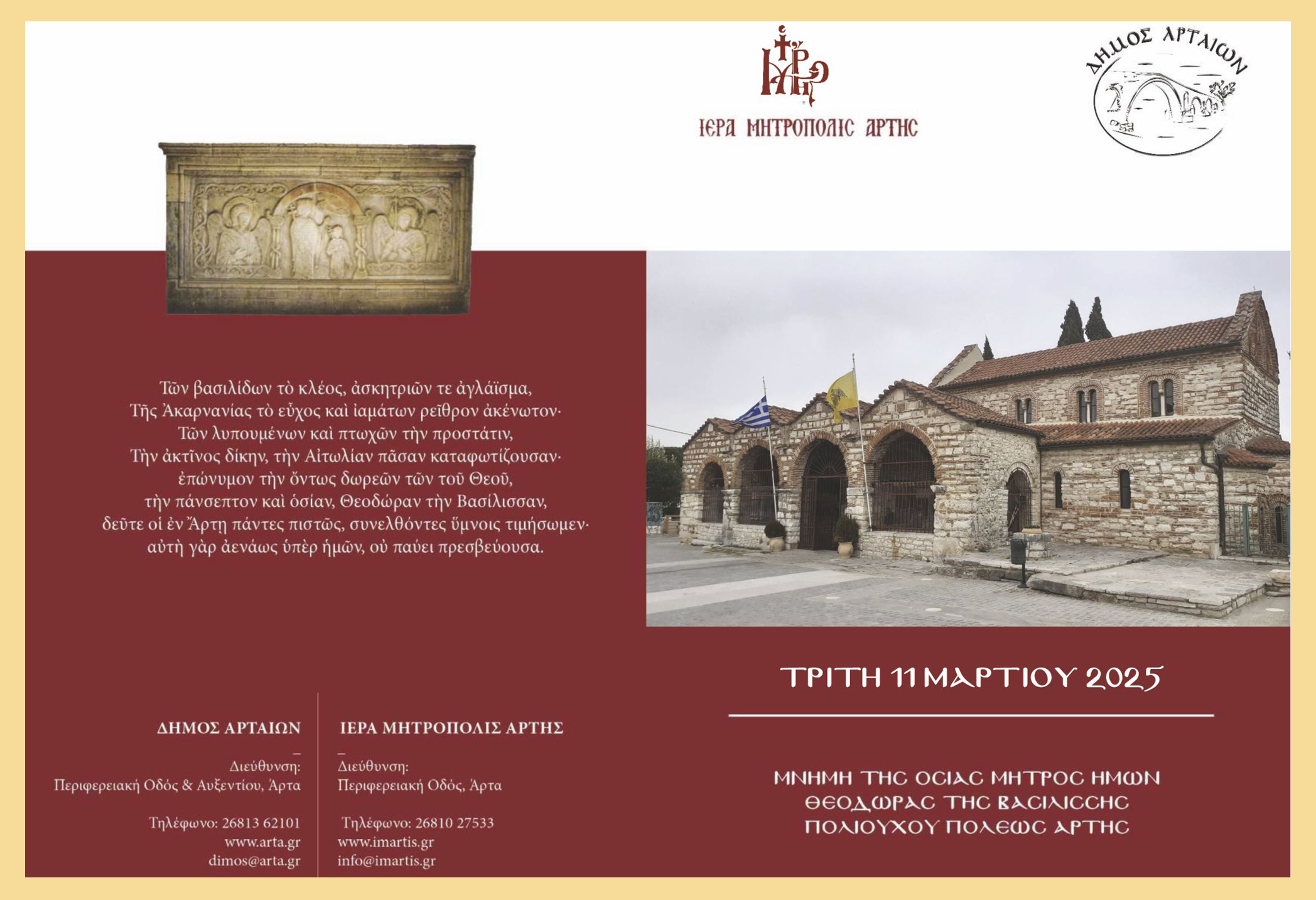 Η Ιερά Μητρόπολη Άρτας και ο Δήμος Αρταίων προσκαλούν όλους τους πολίτες και τους επισκέπτες να συμμετάσχουν στις λατρευτικές εκδηλώσεις, αποδίδοντας την πρέπουσα τιμή στη μνήμη της Αγία Θεοδώρας, της Βασίλισσας που αναδείχθηκε σε σύμβολο πίστης, δικαιοσύνης και αγάπης.