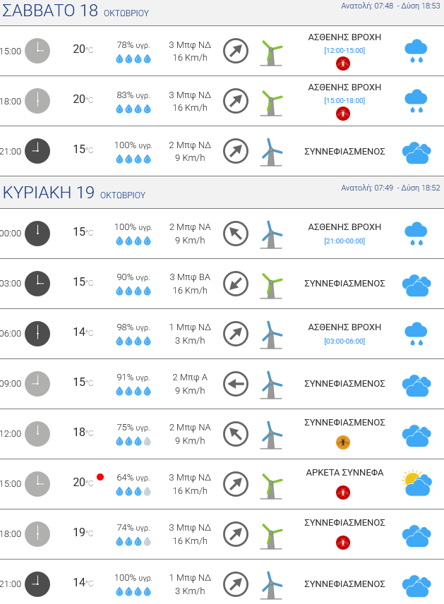 Κυριακή: Από νωρίς το πρωί της Κυριακής οι νεφώσεις, ερχόμενες από το Ιόνιο, θα αυξηθούν εκ νέου στην Ήπειρο και θα ξεκινήσουν να δίνουν τοπικές βροχές. Μέχρι και το μεσημέρι αναμένεται κατά διαστήματα να βρέχει, με ασθενείς έως μέτριες εντάσεις στις περισσότερες περιοχές. Από το απόγευμα και ύστερα ενδέχεται οι βροχές για κάποιες ώρες να ενταθούν και να σημειωθούν και τοπικές καταιγίδες, κυρίως στις νότιες περιοχές. Από αργά το βράδυ ο καιρός θα αρχίσει να βελτιώνεται.