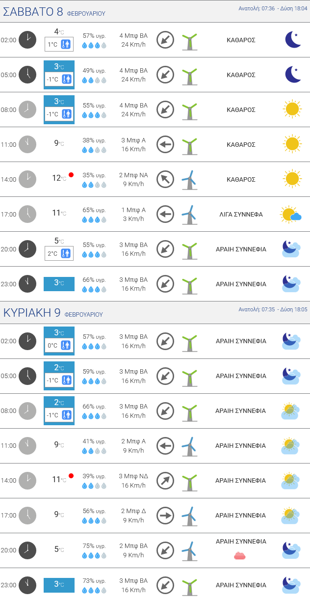 Σάββατο: Με ηλιοφάνεια και αραιές νεφώσεις κατά τόπους και κατά διαστήματα θα κυλήσει το Σάββατο στην Ήπειρο. Διαυγής θα είναι η ατμόσφαιρα, ενώ τη νύχτα και νωρίς το πρωί θα σημειωθεί παγετός στα ορεινά και ημιορεινά.