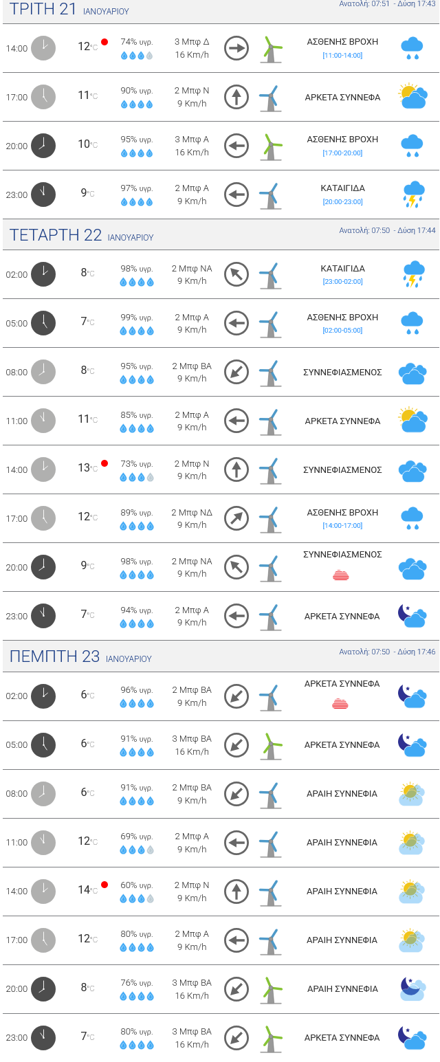 Τετάρτη: Η Τετάρτη θα ξημερώσει με συννεφιά στην Ήπειρο κι ο καιρός θα είναι γενικά άστατος. Έτσι, θα σημειώνονται τοπικού χαρακτήρα βροχές ή μπόρες, φαινόμενα που θα έχουν μικρή διάρκεια κι όχι μεγάλες εντάσεις. Σχετικά γρήγορα, προς το μεσημέρι θα υπάρξουν μεγάλα ανοίγματα με ήλιο από τα δυτικά, τα οποία θα επεκταθούν σε όλες τις περιοχές. Επομένως, ο καιρός θα βελτιωθεί στο δεύτερο μισό της ημέρας.