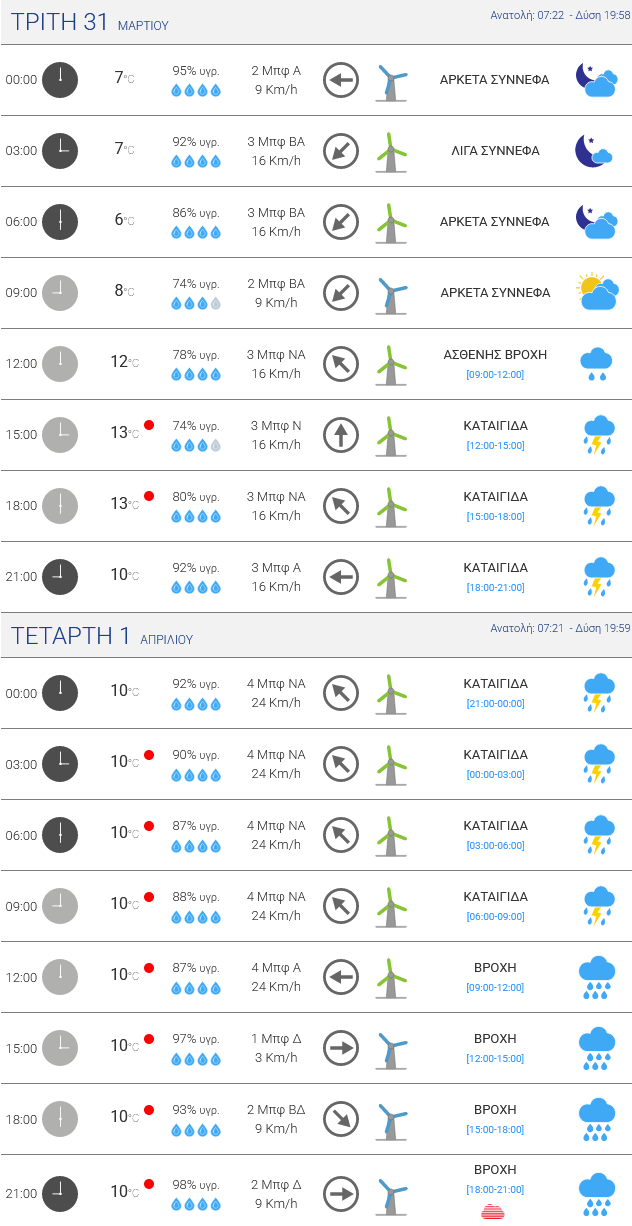 Τετάρτη: Με αρκετά άστατο καιρό θα ξημερώσει και θα κυλήσει η πρώτη μέρα του Απρίλη, η Τετάρτη, στην Ήπειρο. Οι νεφώσεις θα είναι γενικά αυξημένες, δίνοντας τοπικές βροχές, μπόρες, ενώ, κυρίως κοντά στο Ιόνιο, δεν αποκλείονται και τοπικές καταιγίδες. Χιονοπτώσεις θα δέχονται οι ορεινές περιοχές, άνω των 1200-1300 μέτρων κατά μέσο όρο. Τα φαινόμενα δε θα είναι συνεχή και μεταξύ τους θα μεσολαβούν και παύσεις, αλλά και ολιγόωρα ανοίγματα του καιρού.