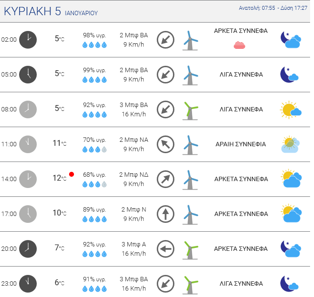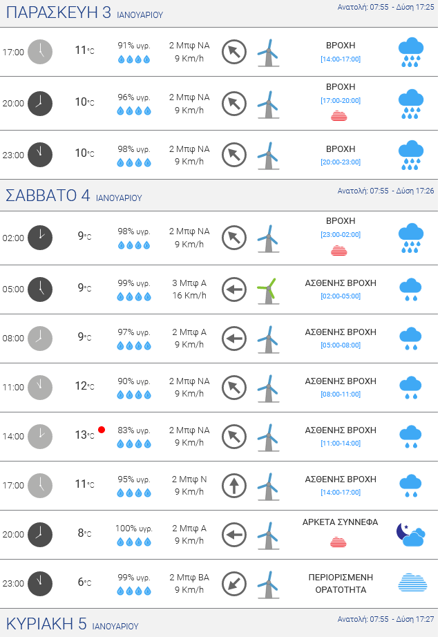 Σάββατο: Μέχρι νωρίς το πρωί του Σαββάτου αναμένονται αυξημένες νεφώσεις στην Ήπειρο και θα εκδηλώνονται μέτριας, γενικά, έντασης βροχές και μπόρες. Παροδικές χιονοπτώσεις αναμένονται στα ορεινά, άνω των 1200-1300 μέτρων. Προς το μεσημέρι τα φαινόμενα θα σταματήσουν και ο καιρός αναμένεται να ανοίξει.