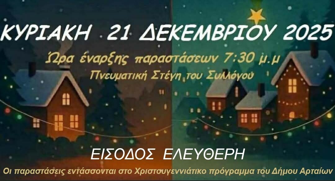 20/12/2025 Θεατρική Χριστουγεννιάτικη παράσταση από τον Μ/Φ “Ο ΣΚΟΥΦΑΣ” Τα παιδικά τμήματα του Θεατρικού Εργαστηρίου του Μουσικοφιλολογικού Συλλόγου Άρτης «Ο Σκουφάς» προσκαλούν σε μια ξεχωριστή χριστουγεννιάτικη βραδιά. Φαντασία, γέλιο…