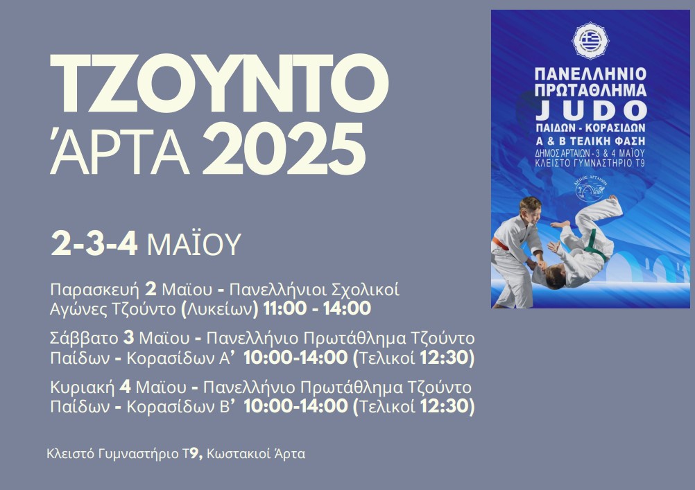 02/05/2025 Πανελλήνιο Πρωτάθλημα Τζούντο στην Άρτα – Πρόγραμμα Δύο σημαντικές διοργανώσεις Tζούντο, φιλοξενεί η Άρτα, αυτό το τριήμερο, υπό την αιγίδα και τη διοργάνωση του Δήμου Αρταίων. Συγκεκριμένα,…
