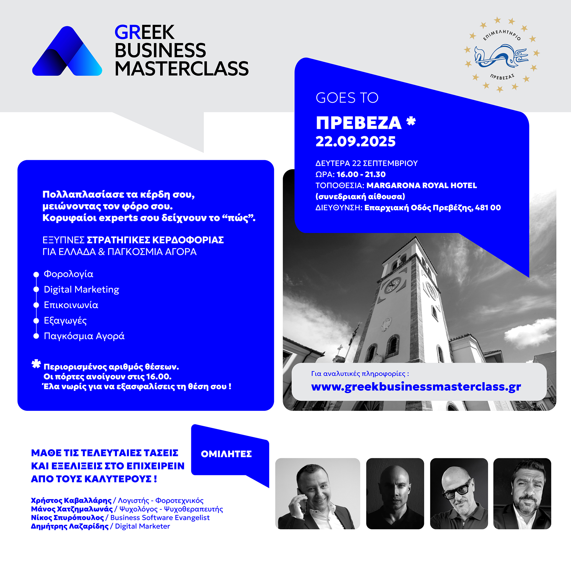18/09/2025 Επιμελητήριο Πρέβεζας – Δωρεάν Masterclass με τον Λογιστή Χρήστο Καβαλλάρη & κορυφαίους επαγγελματίες Το Επιμελητήριο Πρέβεζας σε συνεργασία με το Greek Business Masterclass, σας προσκαλεί στο no1 event επιχειρηματικότητας για να πολλαπλασιάσεις τα κέρδη σου, μειώνοντας τους…