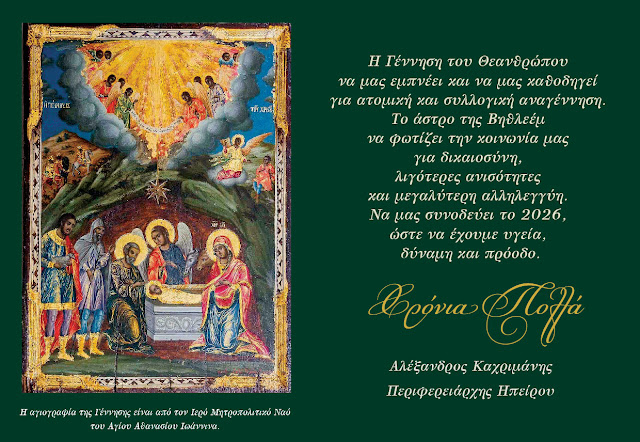 25/12/2025 Ευχές Περιφερειάρχη Ηπείρου “Η Γέννηση του Θεανθρώπου να μας εμπνέει και να μας καθοδηγεί για ατομική και συλλογική αναγέννηση .Το άστρο της Βηθλέεμ…