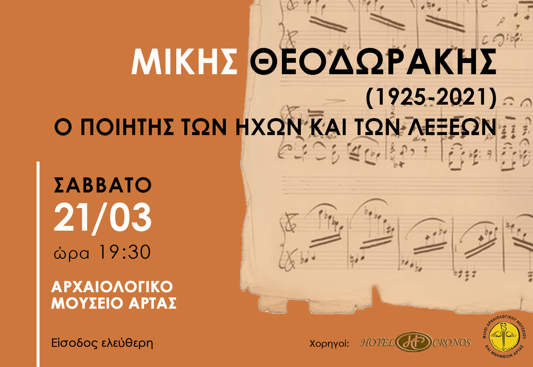 20/03/2026 Εκδήλωση στο Αρχαιολογικό Μουσείο Άρτας, με αφορμή την Παγκόσμια Ημέρα Ποίησης Γιορτάζουμε την παγκόσμια ημέρα ποίησης τιμώντας τον ποιητή ήχων και λέξεων Μίκη Θεοδωράκη (1925-2021). Με τη συμπαράσταση του κριτικού και…