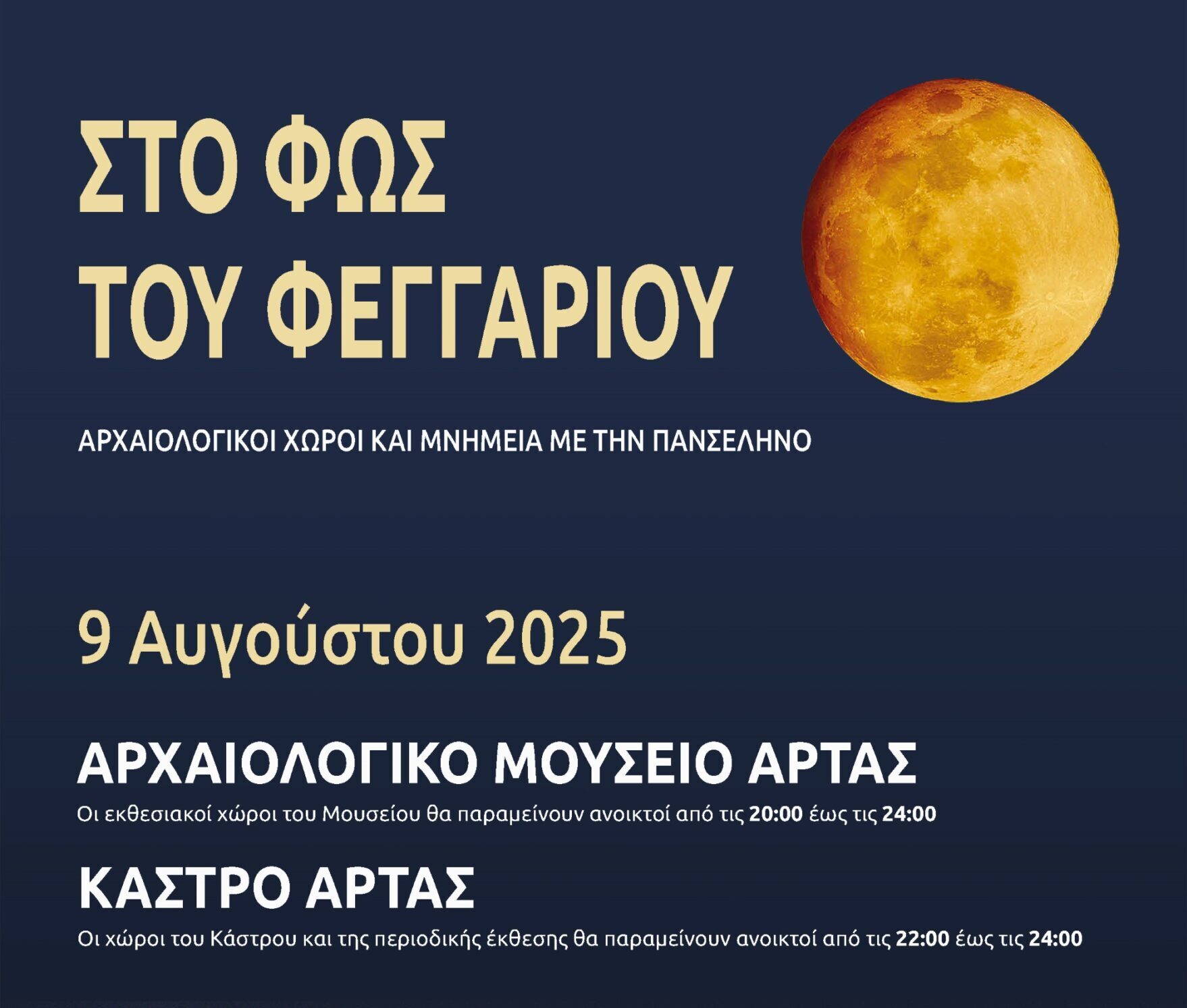 08/08/2025 Αρχαιολογικό Μουσείο Άρτας: Στο φως του φεγγαριού Η Εφορεία Αρχαιοτήτων Άρτας, στο πλαίσιο των εκδηλώσεων του Υπουργείου Πολιτισμού για τον εορτασμό της Αυγουστιάτικης Πανσελήνου που πραγματοποιούνται φέτος…