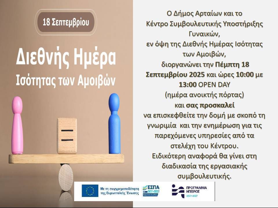 12/09/2025 Εκδήλωση Open Day από τον Δήμο Αρταίων και το Συμβουλευτικό Κέντρο Γυναικών Στις 18 Σεπτεμβρίου γιορτάζεται η Διεθνής Ημέρα Ισότητας των Αμοιβών, η οποία θεσπίστηκε με απόφαση της Γενικής Συνέλευσης του ΟΗΕ…