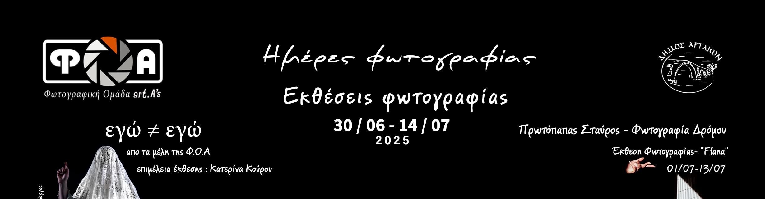 30/06/2025 Ημέρες Φωτογραφίας 2025 – Εκθέσεις Φωτογραφίας στην Άρτα Η Φωτογραφική Ομάδα art.A’s (Φ.Ο.Α.) και ο Δήμος Αρταίων παρουσιάζουν δύο ξεχωριστές εκθέσεις φωτογραφίας που θα φιλοξενηθούν στην πόλη της…