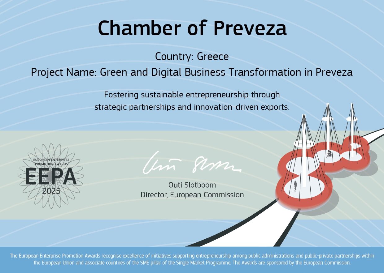 04/08/2025 Παραλαβή του Πιστοποιητικού Εθνικού Νικητή για το Επιμελητήριο Πρέβεζας από την Ευρωπαϊκή Επιτροπή Το Επιμελητήριο Πρέβεζας έχει τη χαρά να ανακοινώσει την επίσημη παραλαβή του Πιστοποιητικού Εθνικού Νικητή στα Ευρωπαϊκά Βραβεία Προώθησης της…
