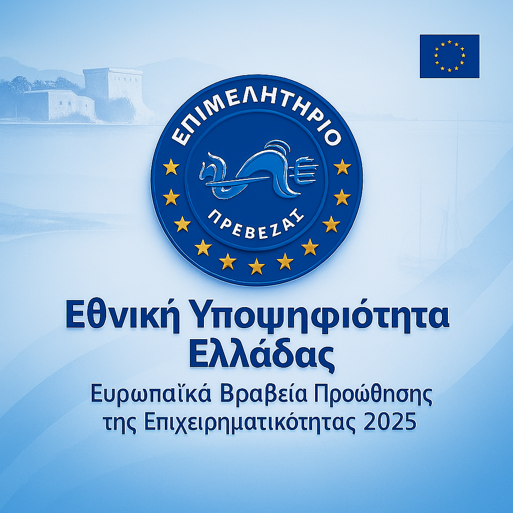 23/07/2025 Μεγάλη διάκριση με εθνική υπογραφή – Το Επιμελητήριο Πρέβεζας στα Ευρωπαϊκά Βραβεία Επιχειρηματικότητας 2025 Με ιδιαίτερη τιμή και υπερηφάνεια, το Επιμελητήριο Πρέβεζας ανακοινώνει την επιλογή του ως εθνικός εκπρόσωπος της Ελλάδας στα Ευρωπαϊκά Βραβεία…