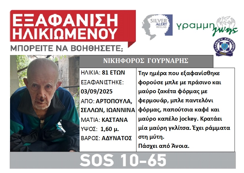 09/09/2025 Ήπειρος: Eξαφάνιση ηλικιωμένου Ο Νικηφόρος Γουρνάρης, 81 ετών, εξαφανίστηκε από το σπίτι του, στην Αρτοπούλα του Δήμου Σελλών στα Ιωάννινα, το μεσημέρι της…