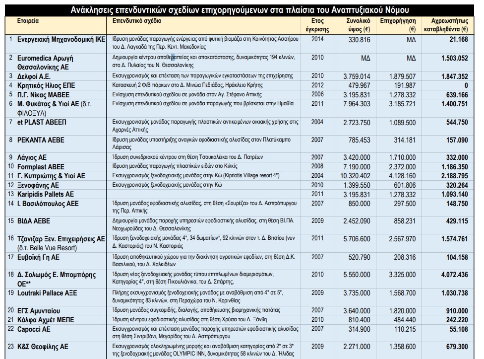 Μεταποιητικές επιχειρήσεις, εταιρείες παροχής υπηρεσιών logistics και εταιρείες παροχής υπηρεσιών φιλοξενίας (ξενοδοχειακές) απαρτίζουν κυρίως τον καμβά των επιχειρήσεων που έλαβαν χρήματα από Αναπτυξιακό Νόμο (Α.Ν.) και δεν ολοκλήρωσαν τα επενδυτικά τους σχέδια. Για τον λόγο αυτό η κυβέρνηση και το υπουργείο Ανάπτυξης ζητεί πίσω τις καταβολές οιονδήποτε επιχορηγήσεων που δόθηκαν όλα τα προηγούμενα χρόνια.
