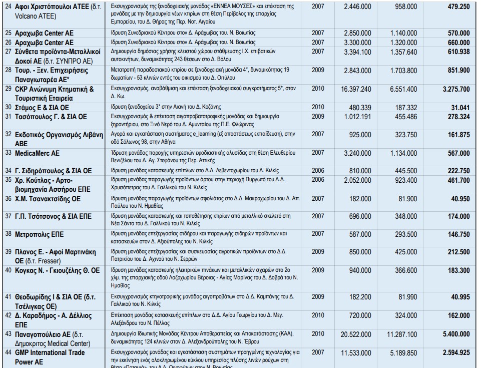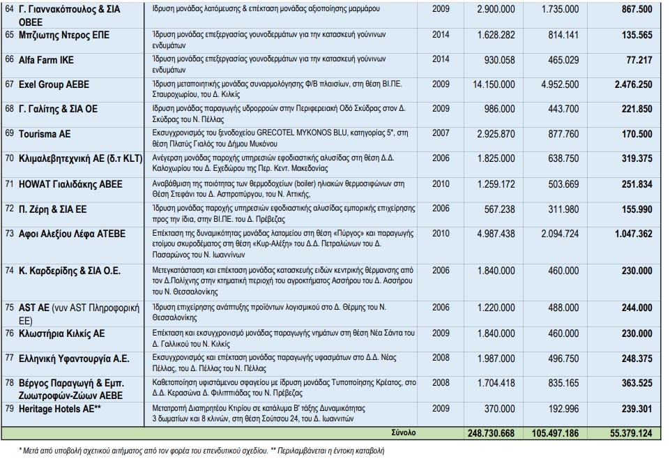 Οι υπόλοιπες αποφάσεις ανάκλησης επιχορηγήσεων από αναπτυξιακό νόμο αφορούν σε επενδύσεις δημιουργίας/εκσυγχρονισμού μονάδων του αγροτοδιατροφικού τομέα, παροχής υπηρεσιών υγείας, δημιουργίας υποδομών (parking), παροχής υπηρεσιών συνεδρίων κ.ά.
