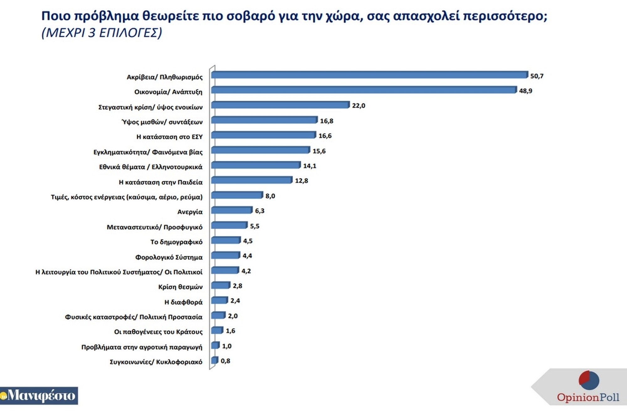 Την οικονομία θεωρούν ως το μεγαλύτερο πρόβλημα οι πολίτες, με την ακρίβεια να βρίσκεται σταθερά στην κορυφή με το 50,7% και να ακολουθούν η οικονομία γενικότερα με 48.9%, η στεγαστική κρίση και το ύψος των ενοικίων με 22% και το ύψος μισθών/ συντάξεων με 16.8%.