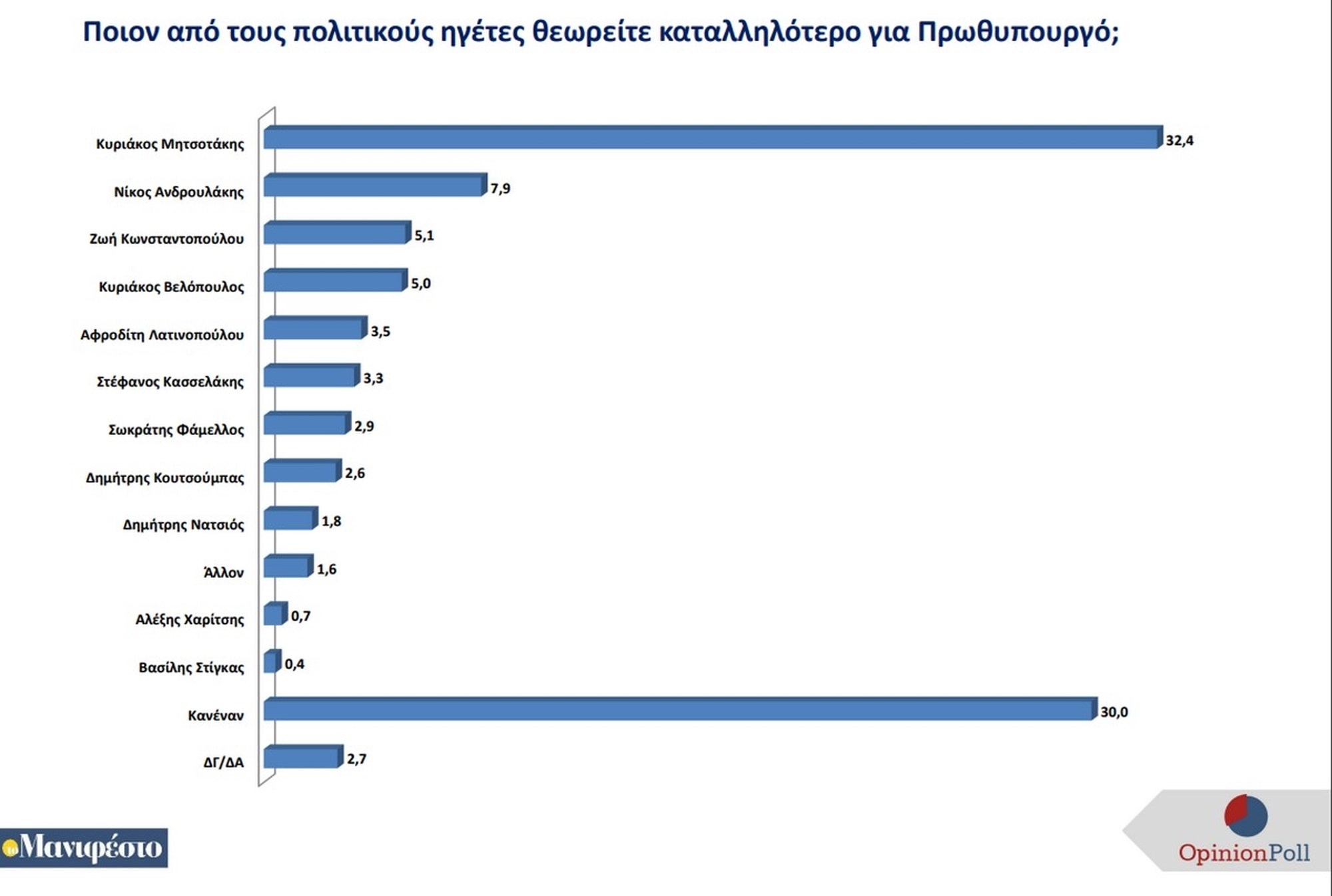 Ακολουθούν η Ζωή Κωνσταντοπούλου με 5.1%, ο Κυριάκος Βελόπουλος με 5%, η Αφροδίτη Λατινοπούλου με 3.5%, ο Στέφανος Κασσελάκης με 3.3% και ο Σωκράτης Φάμελλος με 2.9%. Το 30% επιλέγει τον Κανένα.