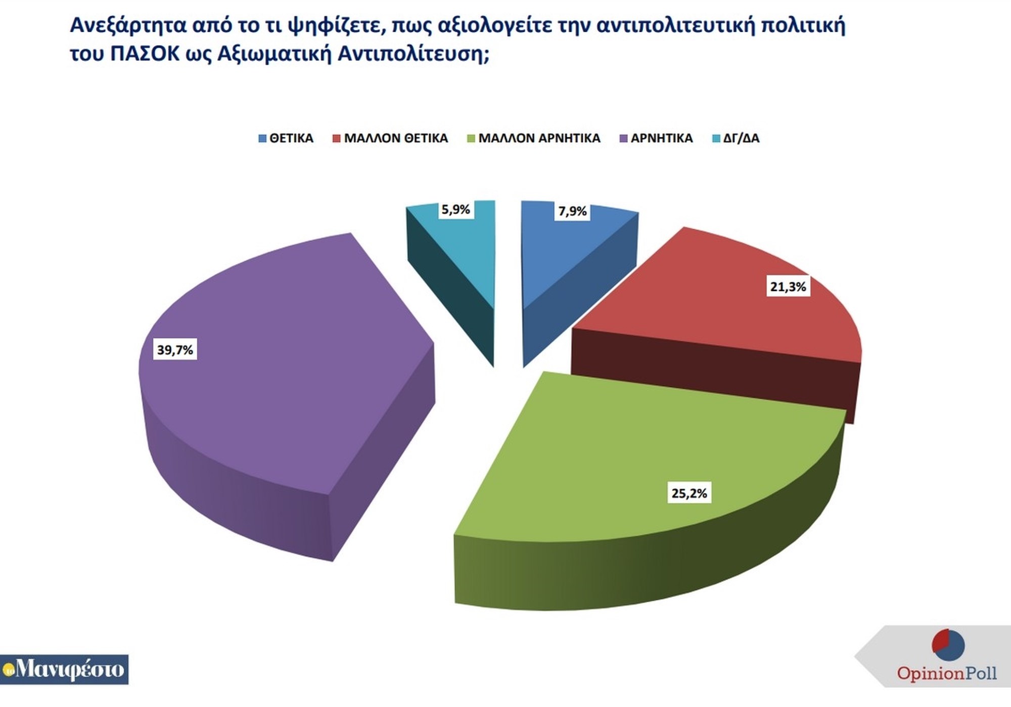 Οι θετικές απόψεις για τον τρόπο με τον οποίο αναπτύσσει την αντιπολιτευτική τακτική του το ΠΑΣΟΚ φτάνουν το 29.2%, ενώ αρνητική άποψη έχει το 64.9%. Ανάμεσα στους ψηφοφόρους του ΠΑΣΟΚ οι θετικές απόψεις φτάνουν το 62%, ενώ αρνητική άποψη έχει το 35.1%.