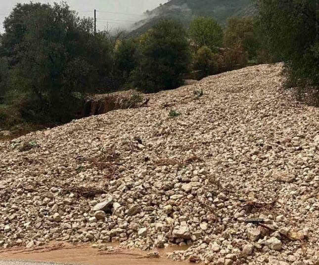 Σε άλλο βίντεο του ίδιου μέσου ενημέρωσης διακρίνεται ένα ορμητικό ποτάμι αναμειγμένο από λάσπη και φερτά υλικά να διασχίζει τον κεντρικό δρόμο της περιοχής.