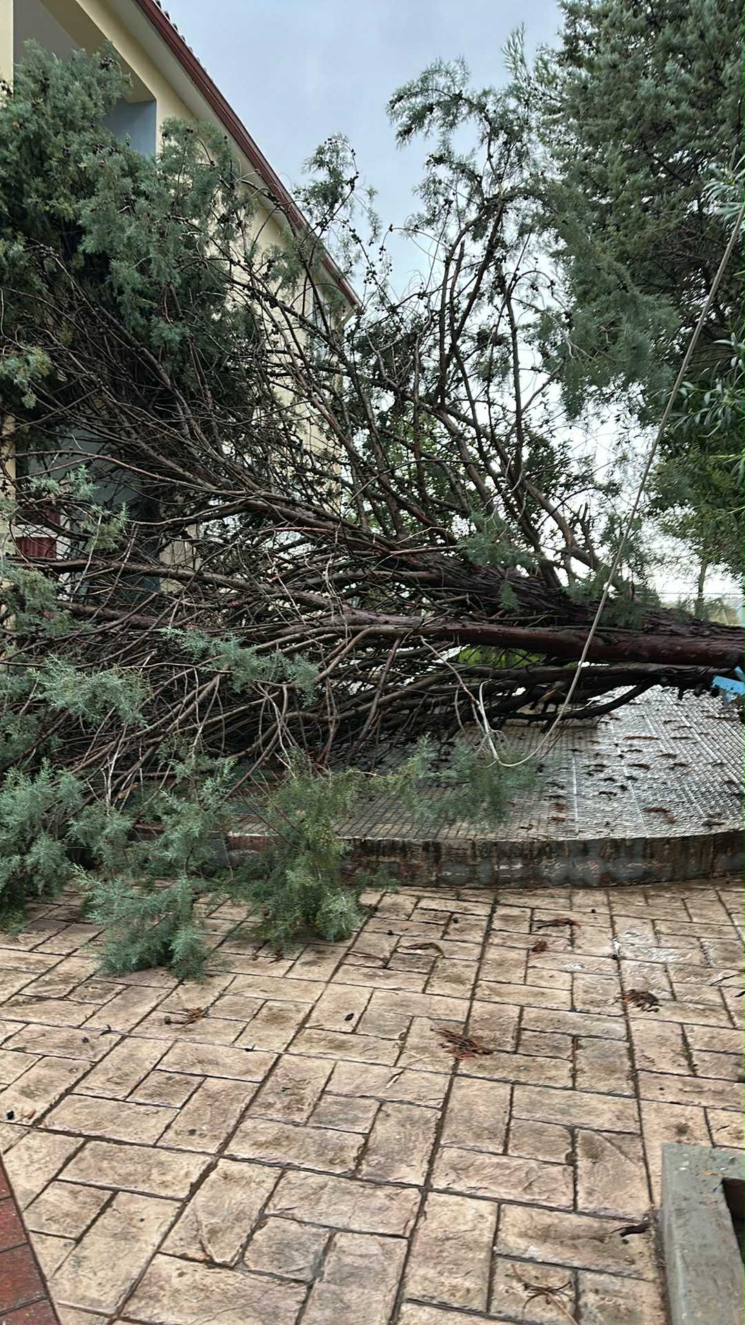 Όπως φαίνεται και στις φωτογραφίες του 7 meres.gr τα δέντρα έπεσαν στην αυλή του σχολείου προκαλώντας – ευτυχώς- μόνο υλικές ζημιές.
