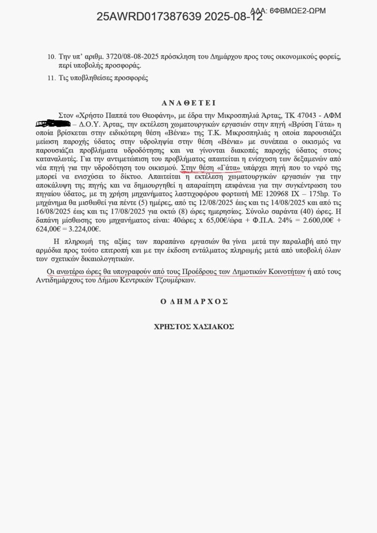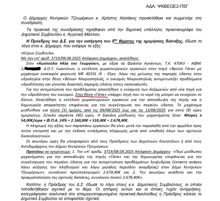 Και σαν να μην έφτανε αυτό, στις 26/08/2025 έφεραν προς ψήφιση, στη συνεδρίαση της Δημοτικής Επιτροπής, νέα απόφαση του Δημάρχου, ξανά για την πηγή «ΓΑΤΑ», για εκ νέου μίσθωση μηχανήματος αποκάλυψης της πηγής, αυτή τη φορά με κόστος 3.224,00 €.
