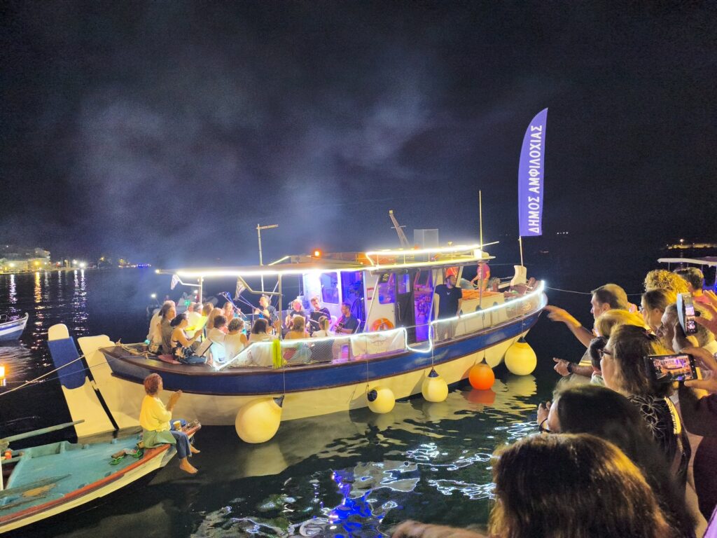 Δεκάδες αλιευτικές βάρκες συνόδευσαν το καράβι με τους χορωδούς σε  μια μουσική βαρκάδα που διέσχισε όλη την παραλία της Αμφιλοχίας, υπό τις οδηγίες του μαέστρου Βαγγέλη Κοτρότσιου.
