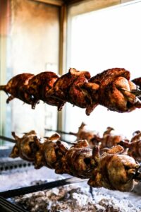 Χωρίς περίεργες μαρινάδες και τεχνάσματα (μόνο ρίγανη, αλάτι και λεμόνι στην κοιλιά), αυτά τα ζουμερά κοτόπουλα γυρίζουν ολημερίς πάνω από αναμμένα κάρβουνα και ξύλα οξιάς για να πάρουν τη μοναδική νοστιμιά τους και σε προσκαλούν από τη βιτρίνα των κλειστών φούρνων να διαλέξεις το δικό σου.