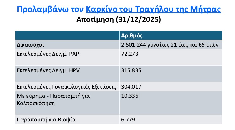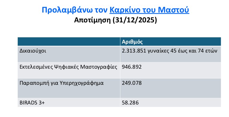 Τα δεδομένα αποτυπώνουν τη συμμετοχή στον προσυμπτωματικό έλεγχο για τον καρκίνο του μαστού, τον καρκίνο του τραχήλου της μήτρας και τον καρκίνο του παχέος εντέρου, καταγράφοντας με σαφήνεια τόσο τον αριθμό των δικαιούχων όσο και εκείνων που προχώρησαν σε αρχικό ή περαιτέρω έλεγχο.