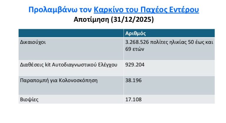 Το πρόγραμμα πρόληψης για τον καρκίνο του παχέος εντέρου απευθύνεται σε άνδρες και γυναίκες ηλικίας 50 έως 69 ετών και ξεκινά με τη δωρεάν διάθεση self-test μέσω των φαρμακείων.