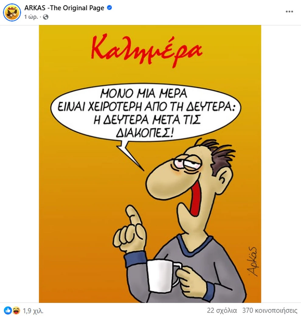 «Μόνο μια Δευτέρα είναι χειρότερη από τη Δευτέρα, η Δευτέρα μετά τις διακοπές» επισημαίνει στο σκίτσο του ο Αρκάς.