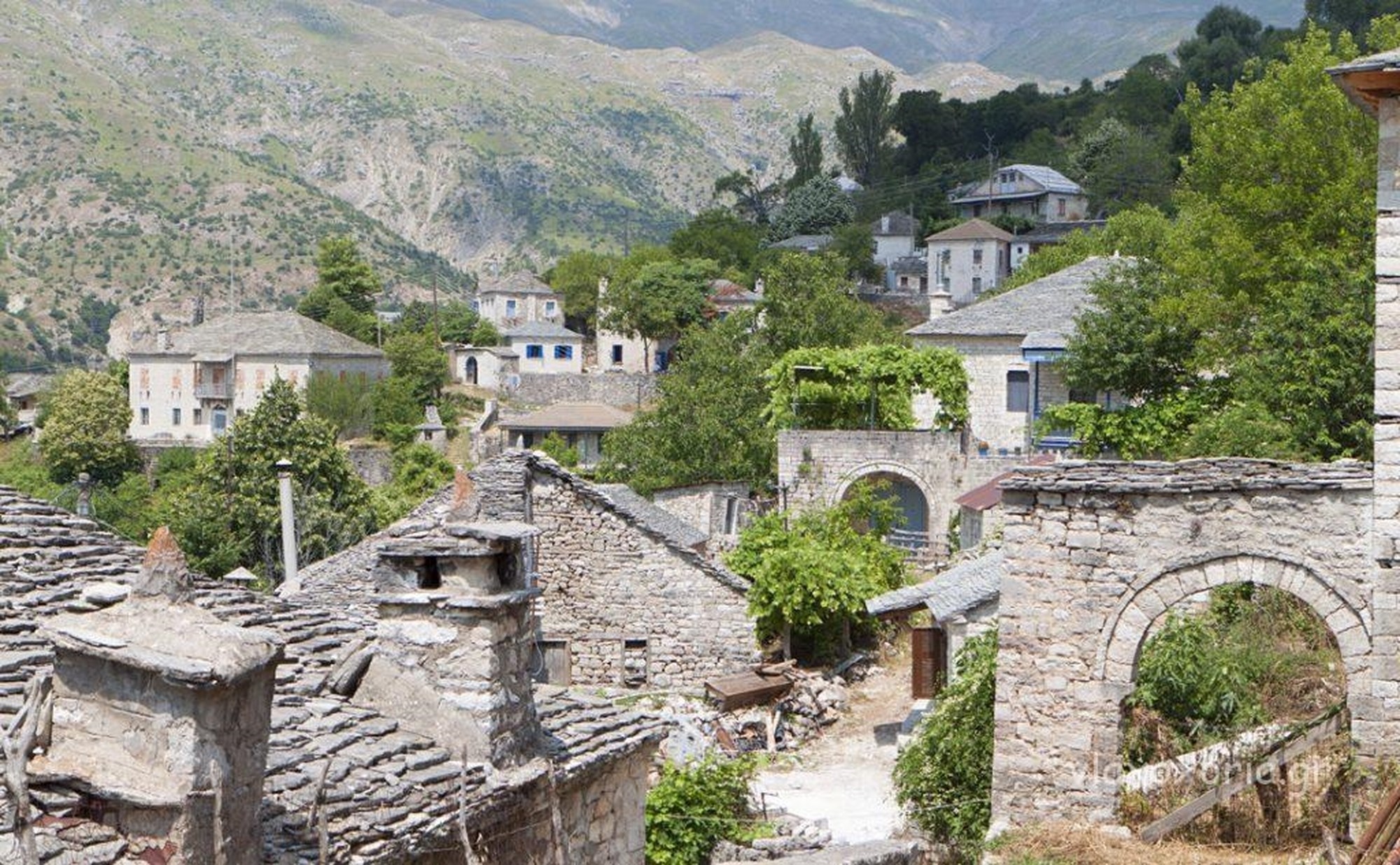 Η γκρίζα πέτρα είναι το κύριο υλικό δόμησης και τα κυρίαρχο αρχιτεκτονικό στοιχείο των σπιτιών του χωριού. Χρησιμοποιείται άφθονη για την οικοδόμηση των σπιτιών, τις στέγες, τα δάπεδα στα κατώγια, τις αυλόπορτες και τις αυλές, το στρώσιμο στα καλντερίμια, την κατασκευή σκέπαστρων για τις βρύσες. Χαρακτηριστικό γνώρισμα ορισμένων μεγάλων οικιών είναι οι πέτρινες καμάρες στο ισόγειο, που στηρίζουν το όλο οικοδόμημα. Την εξωτερική δωρική όψη της οικίας με την πελεκητή πέτρα και τα ξύλινα σαζάνια, αντισταθμίζουν τα τοξωτά ανοίγματα σε πόρτες και παράθυρα με τα χαρακτηριστικά “κιονόκρανα” εκατέρωθεν.