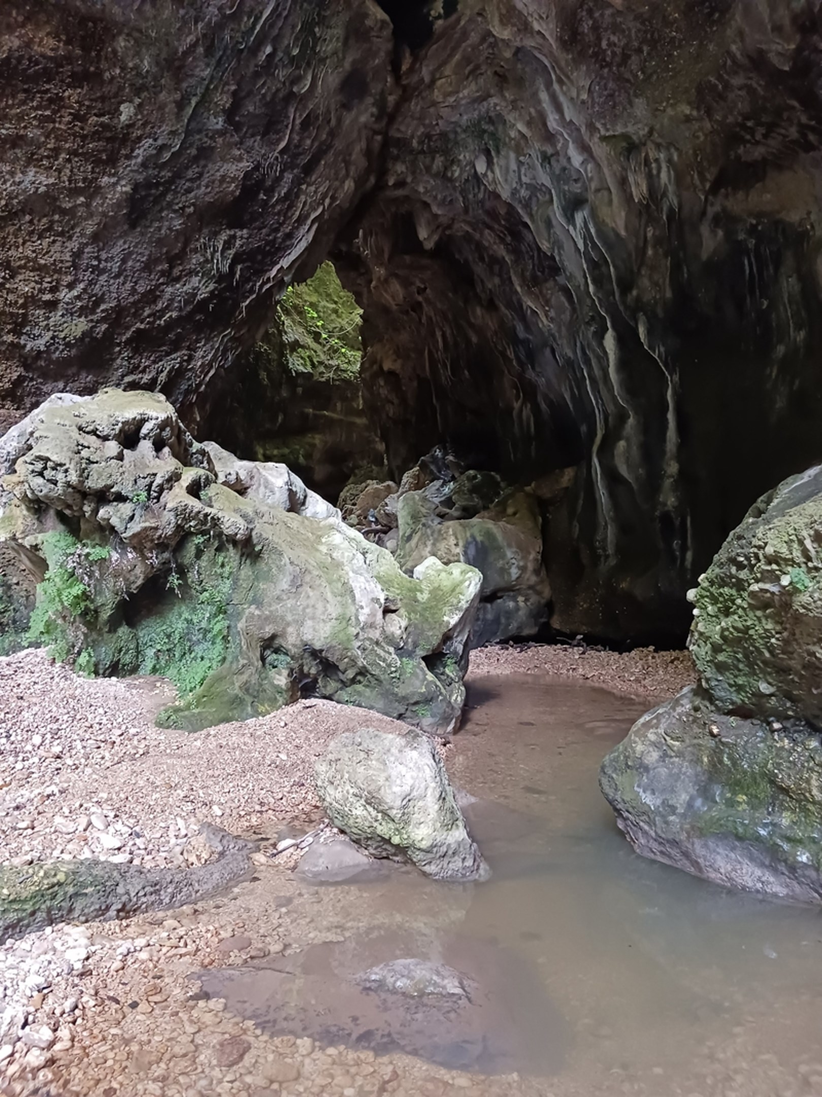 Αφού σκαρφαλώσουμε, με αρκετή δυσκολία είναι η αλήθεια, τα βράχια στην αρχή του σπηλαίου, προχωράμε στο εσωτερικό. Τα ανοίγματα της οροφής φαίνονται πολύ πιο επιβλητικά. Δεξιά, πάνω σε ένα βράχο, ένας πολύ εντυπωσιακός σχηματισμός από σταλακτίτες τραβά την προσοχή μας. Φτάνουμε στην έξοδο του σπηλαίου, που είναι πολύ πιό μικρή από την είσοδο. Το περνά μέσα από το σπήλαιο. Υποθέτουμε, πως από πάνω θα βρίσκεται το πέρασμα από όπου περνούσαν οι άνθρωποι. Σίγουρα δεν περιμέναμε να δούμε κάτι τόσο εντυπωσιακό. Ο ενθουσιασμός μας είναι μεγάλος. Στον δρόμο της επιστροφής, κανονίζουμε την επόμενη Κυριακή να ψάξουμε την κορυφή του Θεογέφυρου, το πέρασμα.